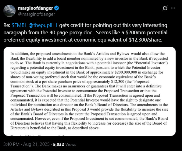 FMBL may be on the receiving end of a $200 million investment from an unknown potential investor. I spend a lot of my time rummaging through the deepest corners of my X account and stumbled upon this.