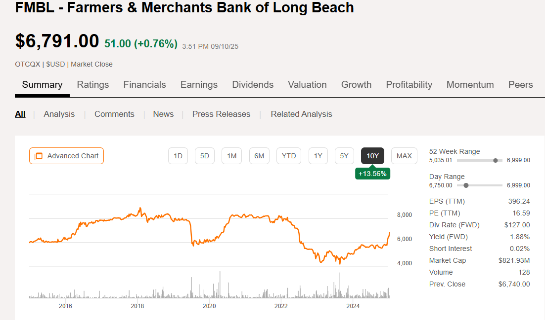 Disclosure: I do not own shares in the Farmers & Merchants Bank of Long Beach ($FMBL) but may buy shares anytime following this article. This is not investment advice. I am not a financial adviser. Do your own research.