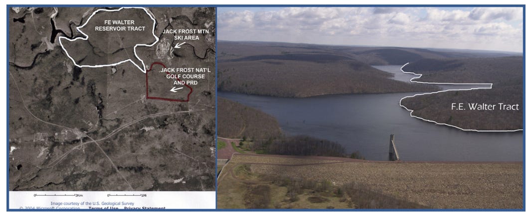 The FE Walter Reservoir Tract is 2,500 acres of unimproved land. Located in the Pocono Mountains of Pennsylvania 2.5 miles from the Northeast Extension of the Pennsylvania Turnpike exit 95 at its intersection with Interstate Route I-80 exit 278. This tract has access through other lands of Blue Ridge Real Estate (Jack Frost National Golf Course Planned Residential Development Tract). This property is 2 hours from New York City and 1.5 hours from Philadelphia, Pennsylvania. The property is zoned for recreation and resort commercial.