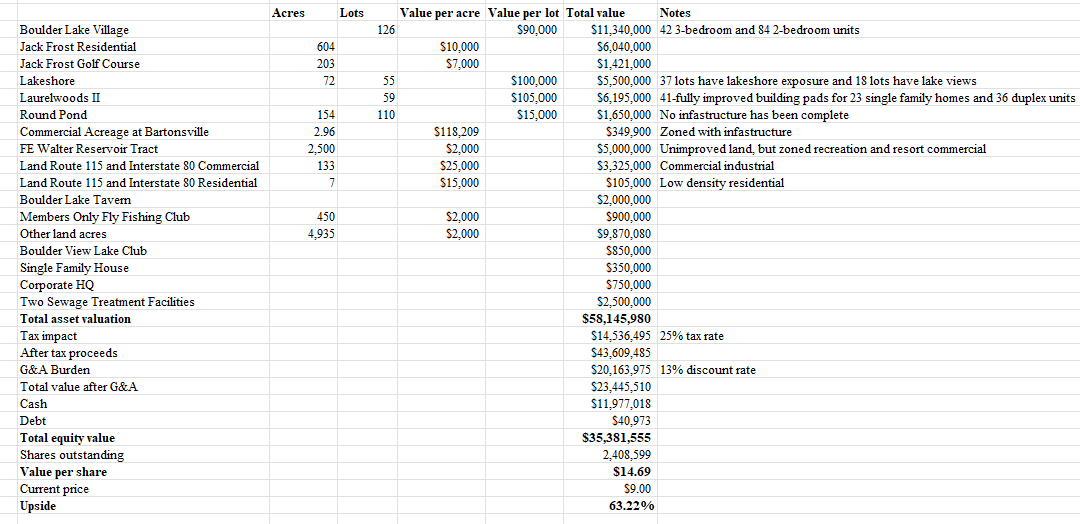 I am valuing these 55 lots at $100,000 per piece or a total valuation of $5.5 million. They are valued slightly higher than Boulder Lake Village given lake front exposure of 37 lots.