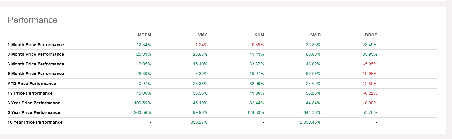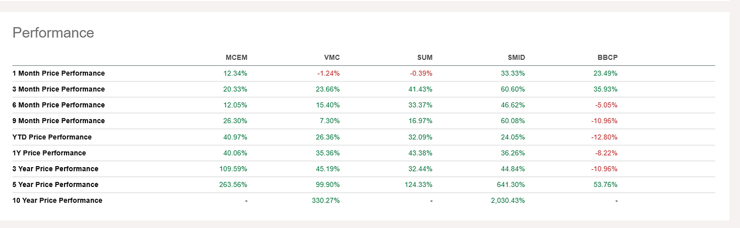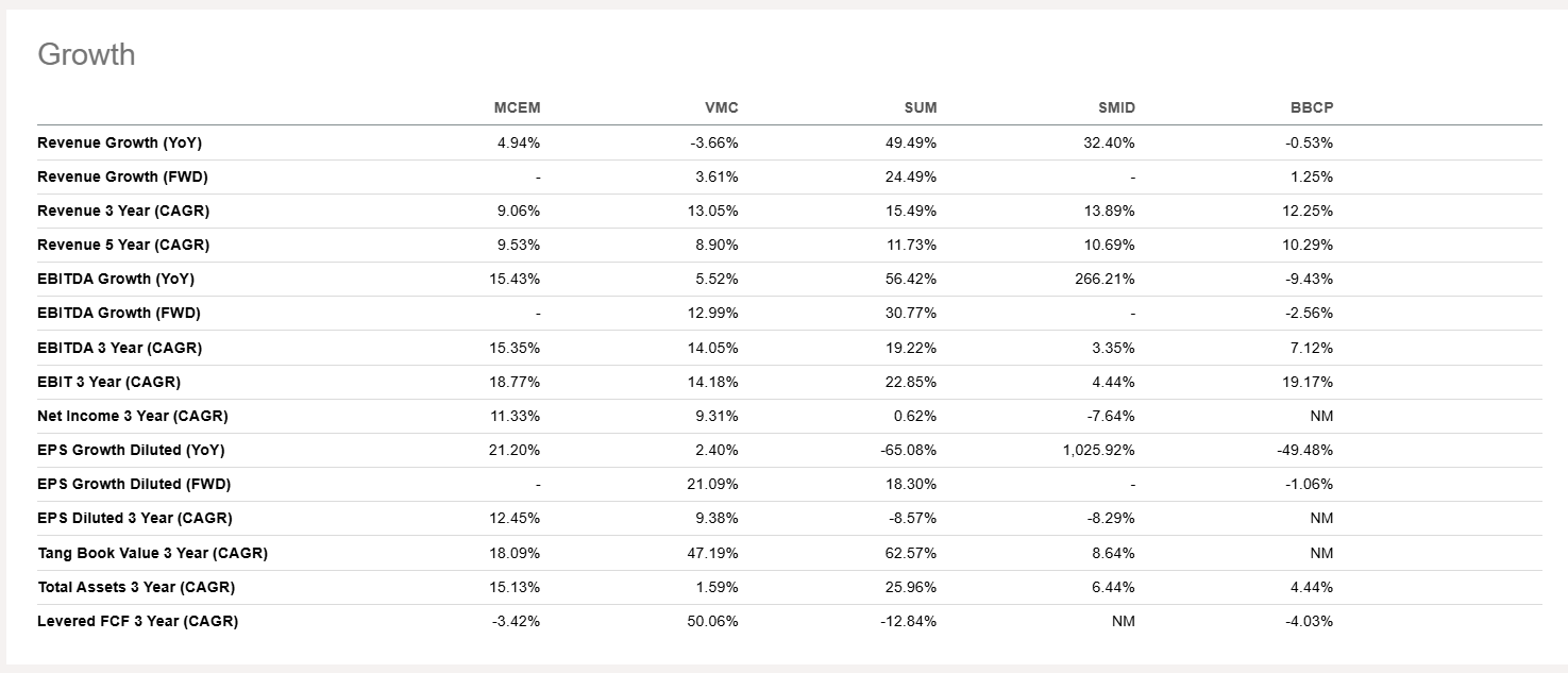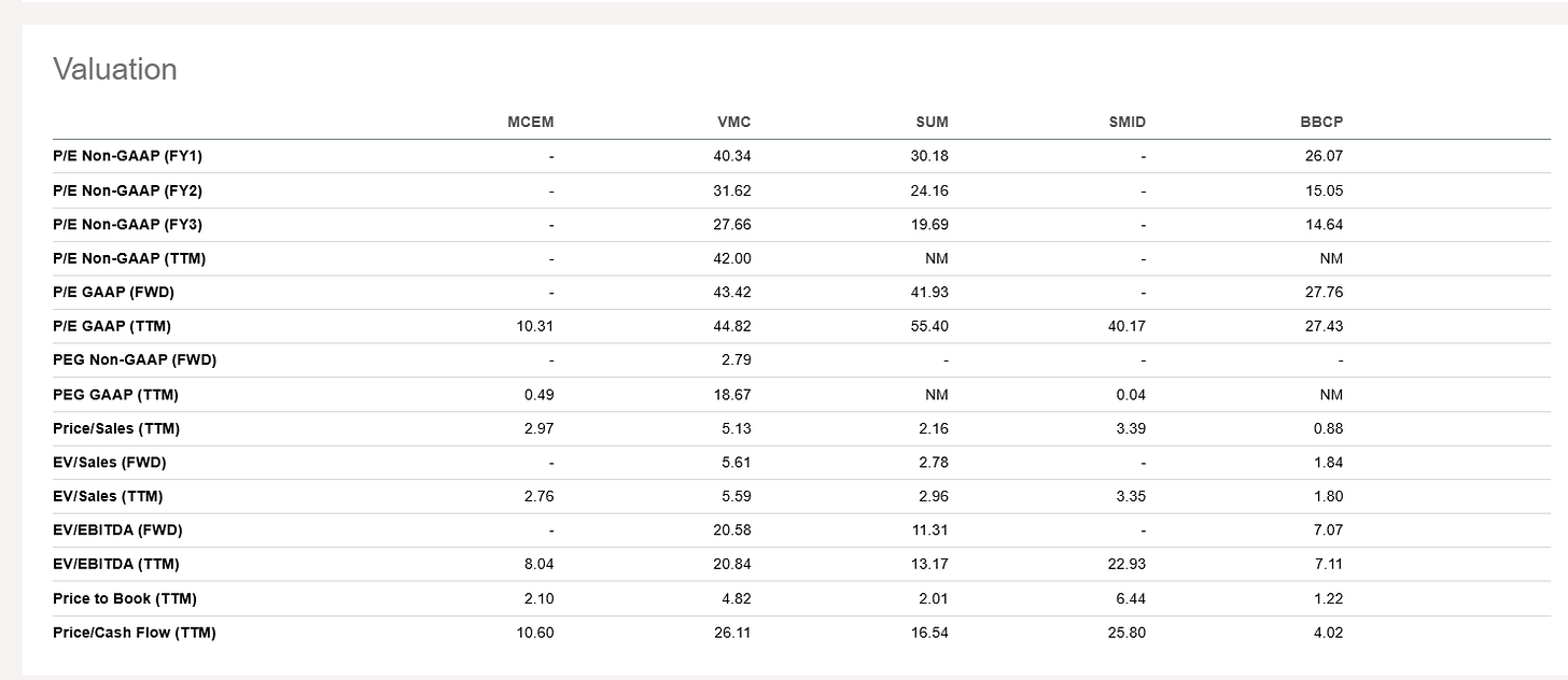 On most finance websites like Seeking Alpha, Yahoo Finance, and CNBC to name a few, you can compare the valuation multiples of the stock you are looking at with the valuation multiples of whatever other companies you choose. For this comparison I chose to stack MCEM up against Vulcan Materials Company (NYSE: VMC), Summit Materials, Inc. (NYSE: SUM), Smith-Midland Corporation (NASDAQ: SMID), and Concrete Pumping Holdings, Inc. (NASDAQ: BBCP). While a lot of construction materials companies handle cement in their business operations, I wanted to compare MCEM to other companies whose operations are made up mostly of cement production in an attempt to compare apples to apples as much as possible.