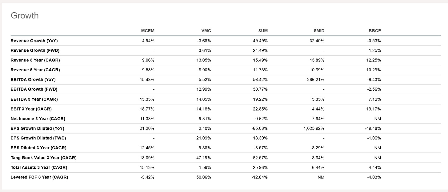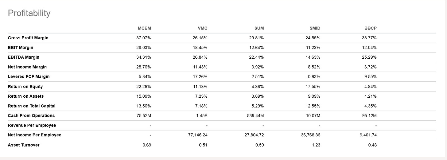 I very much appreciate MCEM’s attention to profitability. It shows a great deal of focus from the management team. As you can see from the chart below MCEM outperforms every one of these comparable companies by quite a bit. It should also be noted that MCEM and VMC are the only companies listed below that have shown a positive net income every year since 2014.