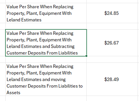 If anything, this cash pile of a liability would just be returned to the customer if NOBH was unable to keep their end of the deal. In fact, so long as NOBH is able to keep building manufactured housing, these deposit values should eventually end up as cash on the asset side of NOBH’s balance sheet. In the chart below I have calculated NOBH’s total value per share should their properties be valued at their potential sale value in the market today. This chart also includes a value per share scenario where NOBH’s customer deposits have been removed from their liabilities as well as a scenario where NOBH’s customer deposits have actually been transferred to the assets side of their balance sheet.