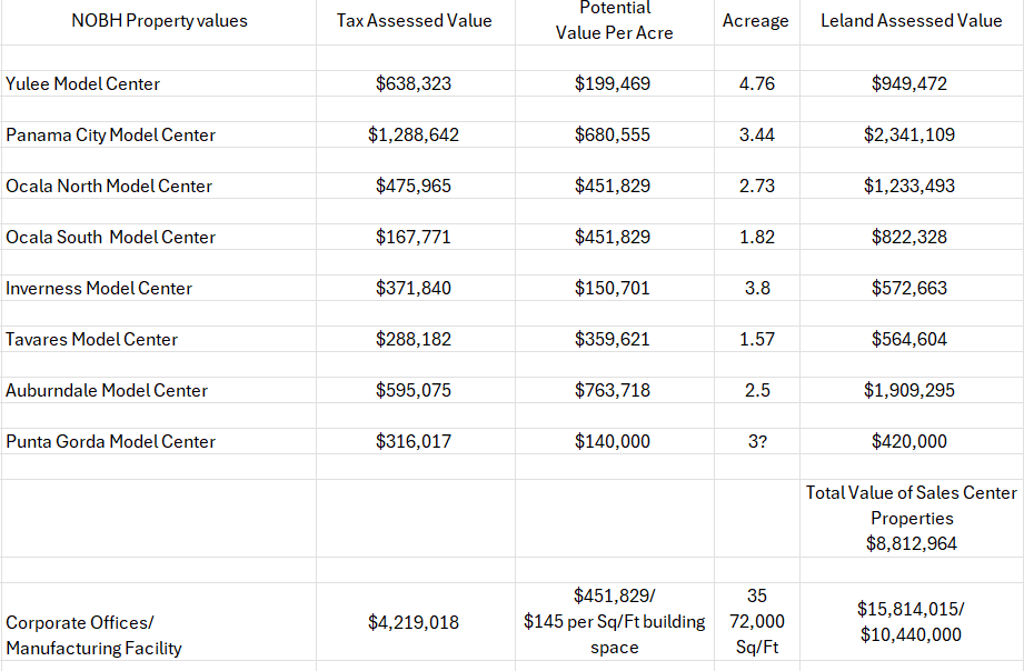 NOBH’s sales centers are pretty easy to understand. They set up a manufactured home on the site that acts as an office for the sales team and staff. The rest of the lot has manufactured homes parked on it waiting to be sold. In my opinion this makes these properties easier to assess than if the company had brick and mortar manufacturing facilities or store fronts on each of these properties. I used empty land lots in the areas close to NOBH’s sales centers in order to be able to compare how much NOBH’s land might be worth in the event that they sold it off today. A lot of NOBH’s sales centers are located at or close to large highway or freeway intersections in Florida and the potential sale price for these properties reflects that.