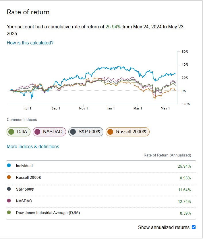 Ever so often, I’d like to reiterate my investment philosophies in my articles. This is mainly to give any of my readers that may be unfamiliar with value investing a little run down of what I am generally looking for when I am scouring the web looking for investment opportunities. My value investing principles aren’t very complicated and most investors probably can’t afford to dump hundreds of thousands or even millions of dollars into the market yet they learn their investment principals from famous investors who do have to invest that much money into a business just to make a dent in the their portfolios. Obviously these big time investors are geniuses at their craft but I personally believe that their potential returns are bogged down by the size of their portfolio and small time investors like myself have an edge by being able to exist in these spaces that big money can’t touch. Of course there are many that disagree with my approach to investing and I’ve seen some volatility in my portfolio at times, including early in 2025, but thus far I’ve had great success. If you’d like to hear more about my specific investments and investing ideas please consider becoming a paid subscriber to The Value Road.