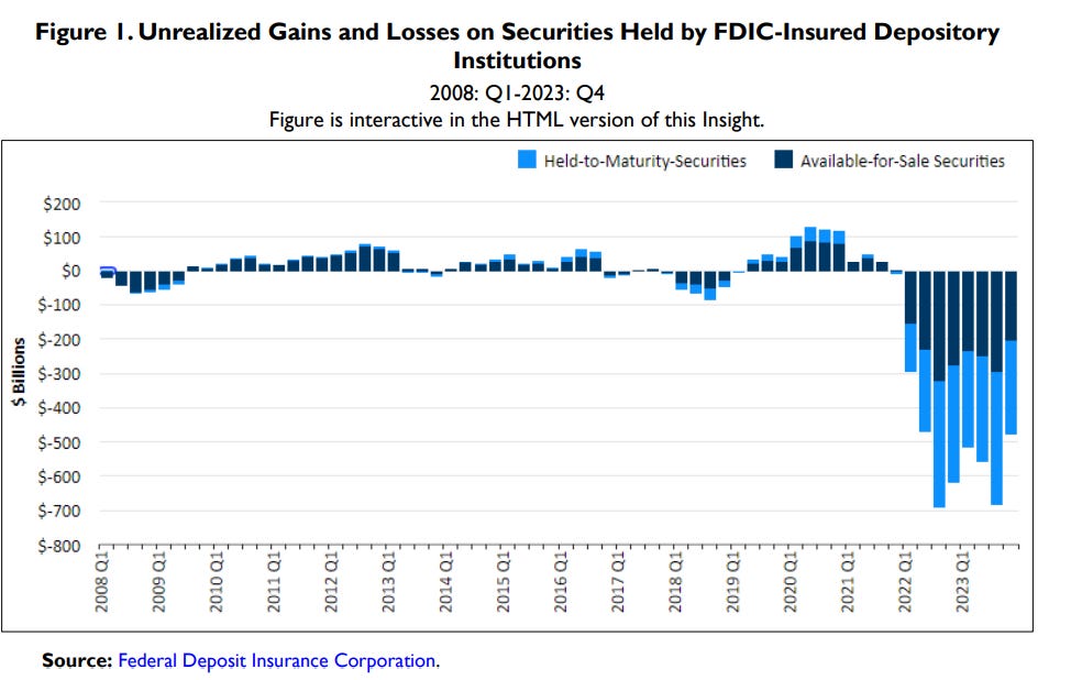 Unrealized and realized losses on bonds and mortgage backed securities are what caused the banking crisis in early 2023. These losses could lead to the banks not having enough assets to back-up consumer deposits and therefore trigger a bank failure.