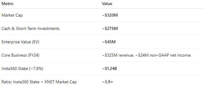 Even after applying steep discounts for lock-up, capital controls, and governance risk, the asymmetry is glaring. If management can unlock even part of the Insta360 value — or if the market begins to recognize it — XNET rerates.
