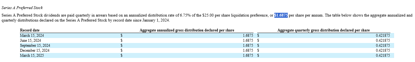 These shares actually pay a 6.75% dividend on a $25.00 preferred share, which is $1.6875 annually. The liquidation preference for these shares is also $25.00. They’re currently selling for $18.30 per share, giving us that annual dividend rate of 9.2% and a 36.6% liquidation upside.