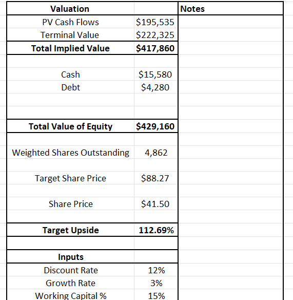 As you can see from the image above, my DCF ended up spitting out an $88.27 per share price target. That is a 112% upside from EACO’s current share price of $41.50.