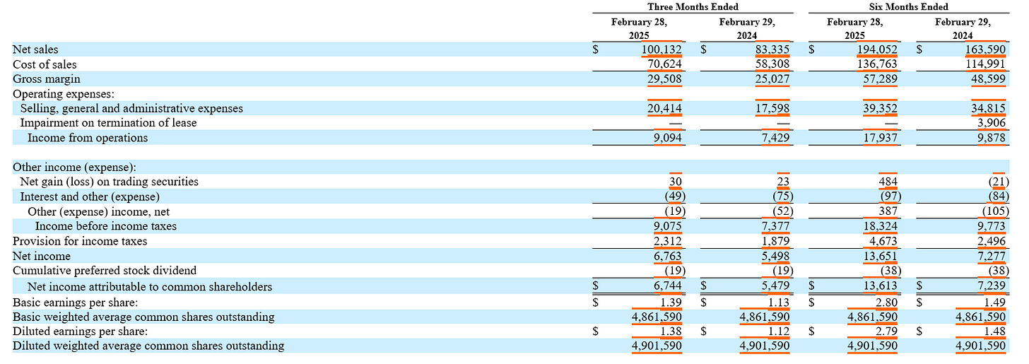EACO’s business model is actually pretty simple. The company found out a long time ago that if it keeps adding to its sales team the company’s operating income will increase faster than their SG&A expenses, growing the company’s bottom line. This is how EACO currently plans to keep expanding their business. Those employee numbers I gave earlier are substantially higher than EACO’s staffing levels at the end of their fiscal 2024. The company added 43 employees as compared to this time last year with 31 of the those being sales employees.