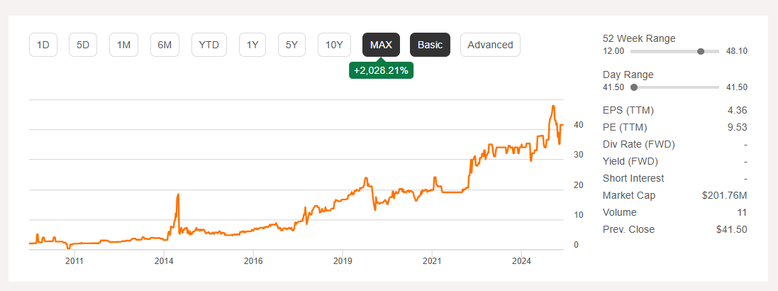 This business has had a long growth story. Their revenue has grown at an average annual rate of 17% since 2015, their operating income has shot from $5.7 million to $32.8 million from 2015 to 2024, and their net income went from $3.7 million in 2015 to $15.0 million in 2024. The company’s net income should actually pop back up into the $21 million range this year as the company had spent a considerable amount of their earning buying their headquarters the year previous. This steady growth over the past decade has led to the company experiencing a $532% increase in their share price during that time frame.